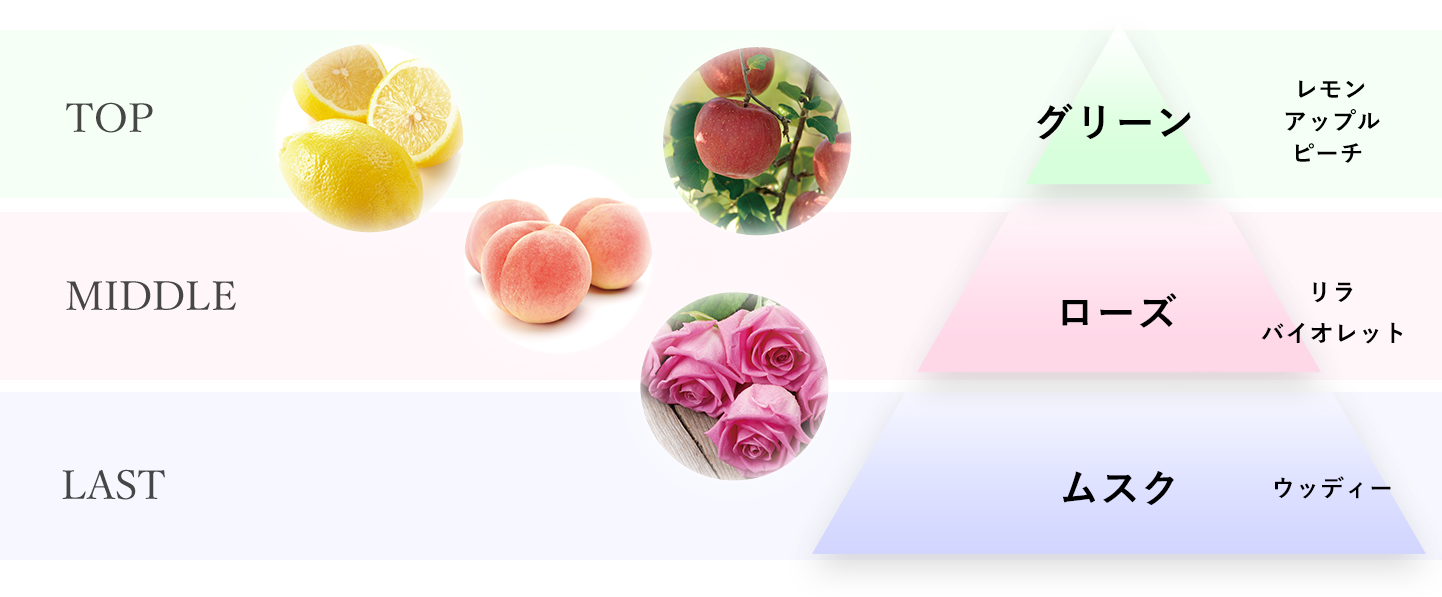 次第に華やかなローズから、あたたかみのあるウッディーやムスクがやわらかに香ります。